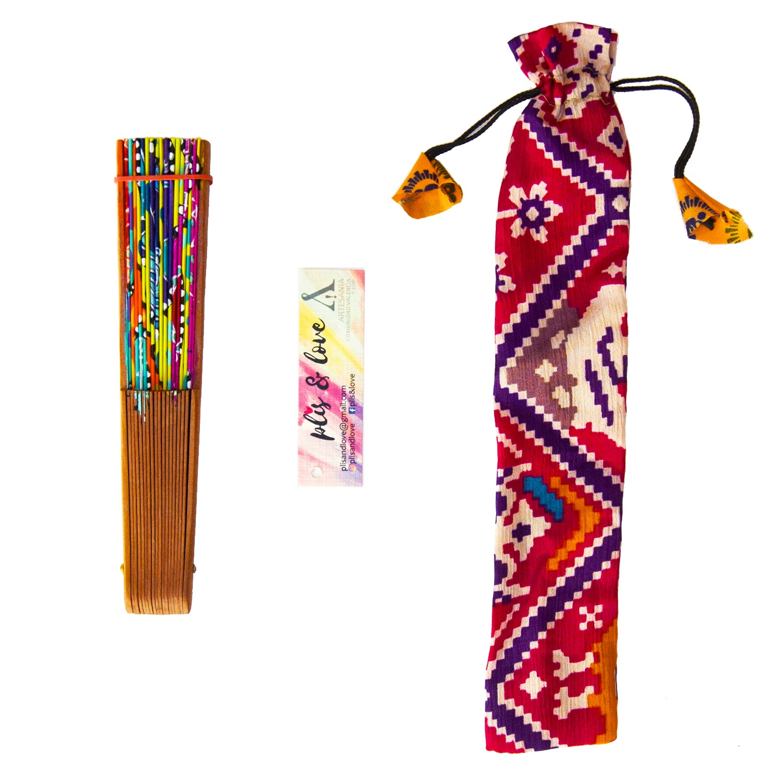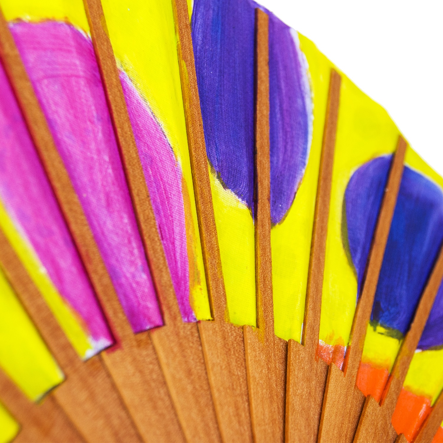 Abanico de madera de peral pintado a mano de 21 cm., un tamaño ideal para poder llevarlo en cualquier bolso, la madera está pulida obteniendo así un toacto directo y natural, las pinturas son especiales para tela de algodón,
