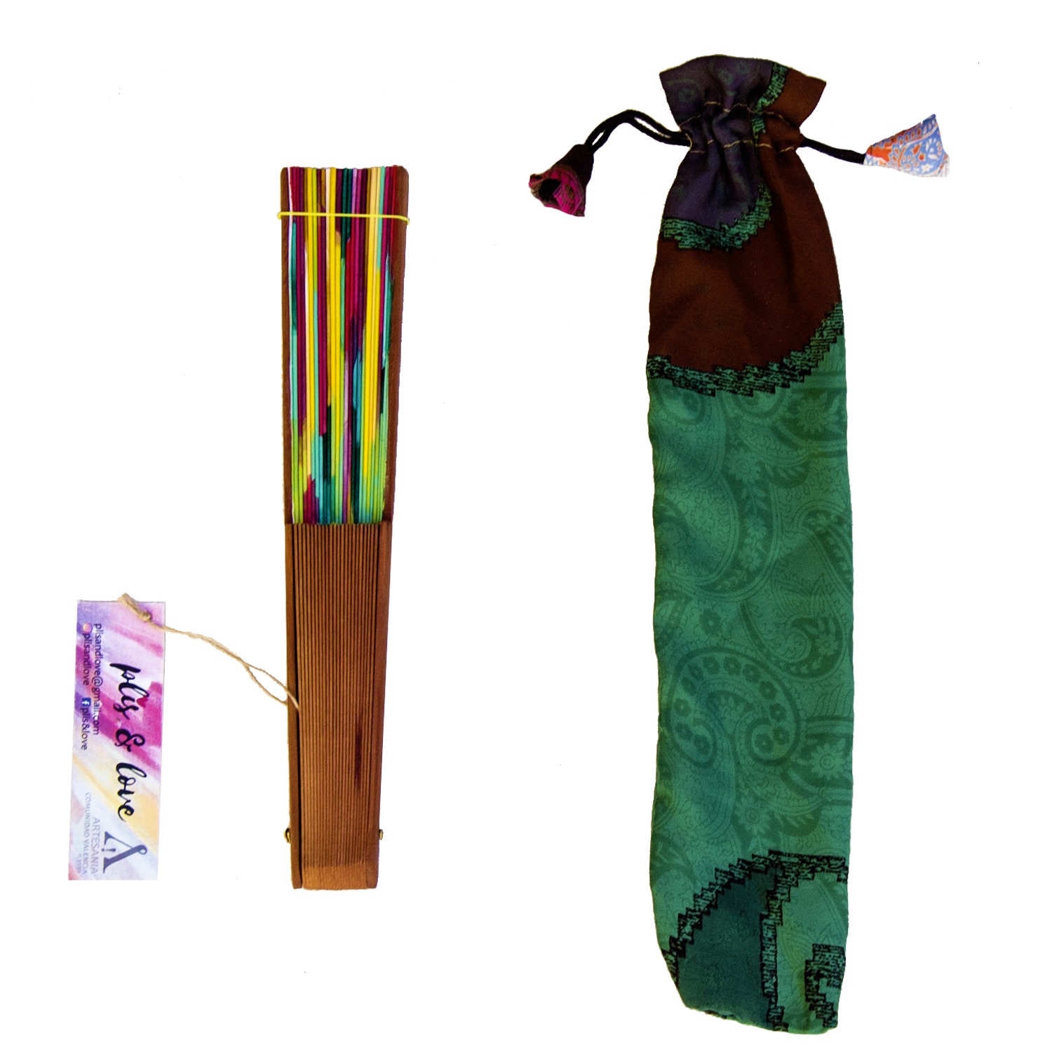 El abanico lleva incluida la bolsa de seda natural y el etiquetado con la explicación de mi trabajo.