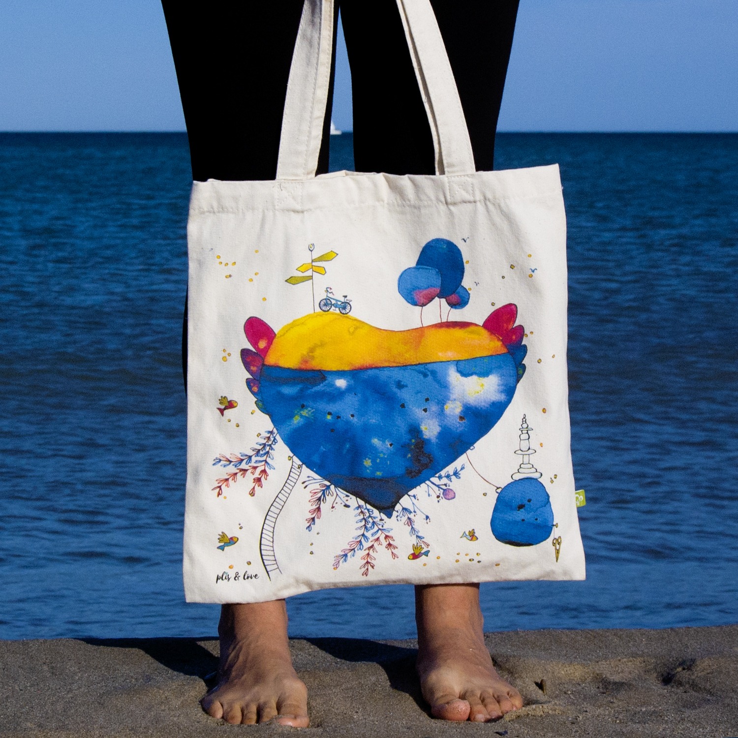 Trabajo con una imprenta local y de pequeño formato para la estampación de mis acuarelas en las totes, colaborando así con la economía local. Éste fue una de mis principales ideas cuando empecé el proyecto de Plis&Love: quería repartir el pastel con la gente de mi casa, de mi barrio, de la ciudad donde vivo. Con la compra de esta tote estas colaborando conmigo, con el pequeño comercio y de cercanía, contribuyendo a una economía circular y sostenible.